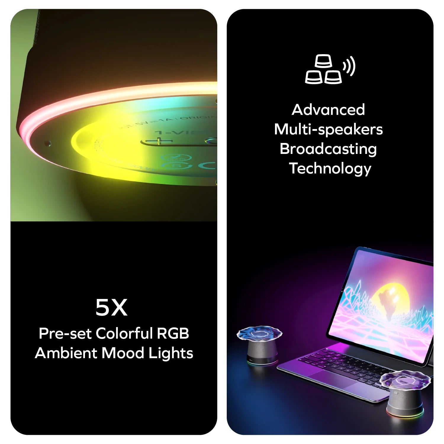 This revolutionary wireless speaker combines advanced multi-speaker broadcasting technology with dynamic RGB mood lighting to create personalized audio-visual experiences that travel with you.