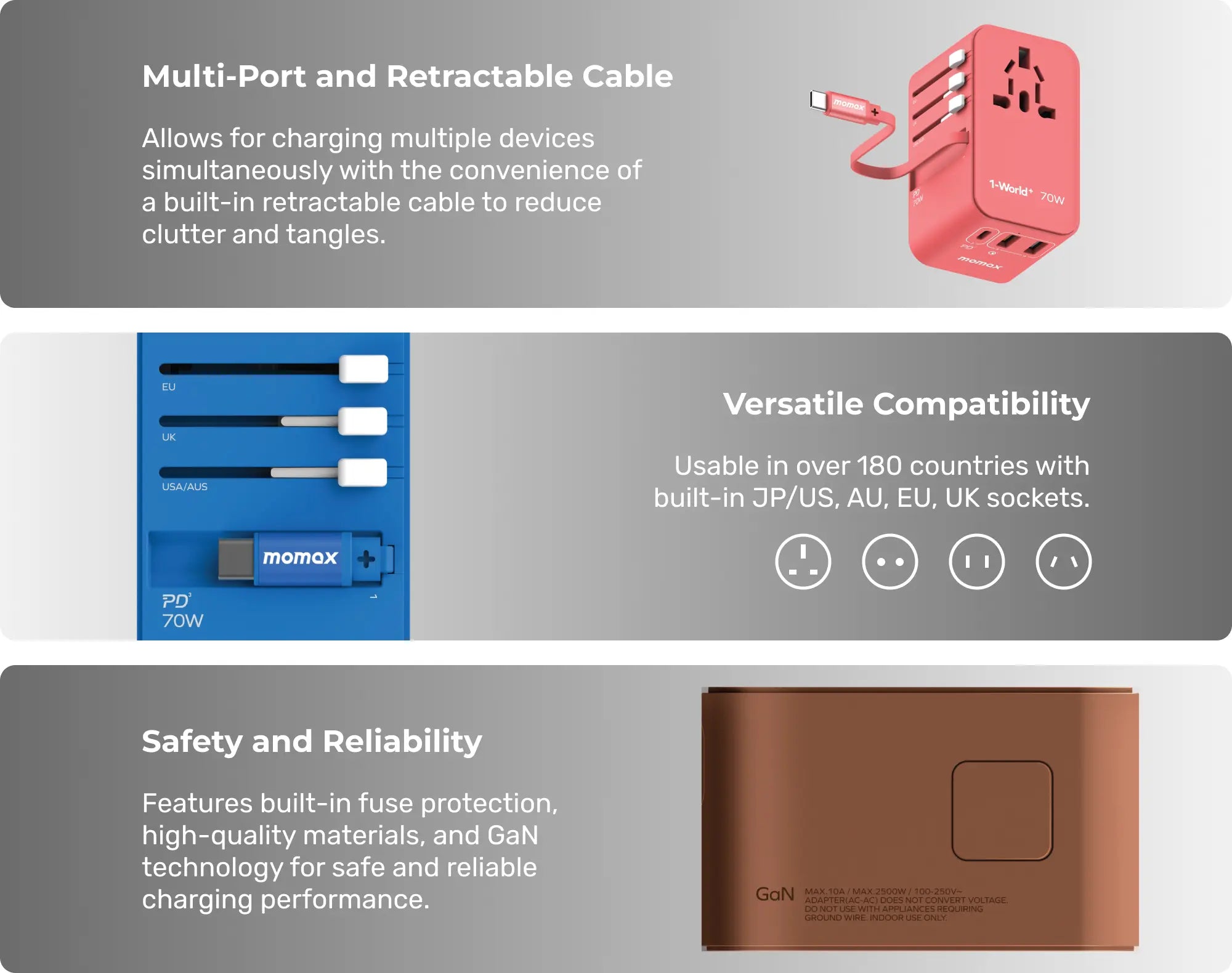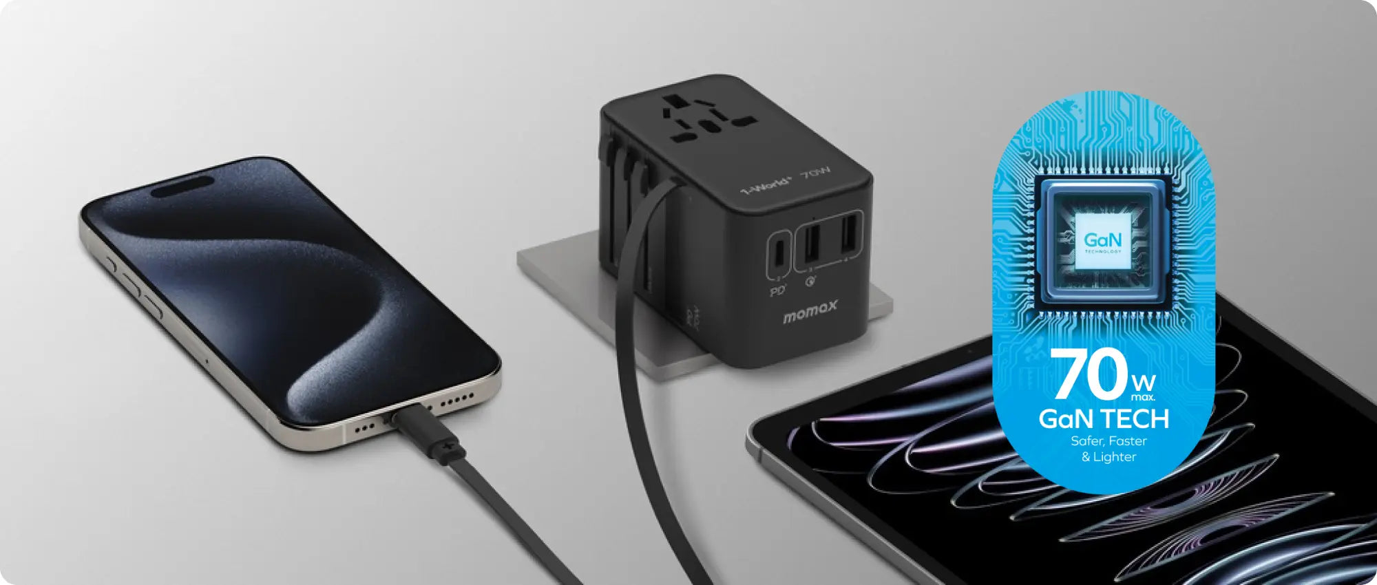 Travel light with the 70W power solution from Momax and leave your other charges at home! Using GaN technology, the 1-World 3-Port GaN 70 Travel Charger dynamically optimizes power delivery to provide the fastest and safest charging for your MacBook, phones, laptops, and more.