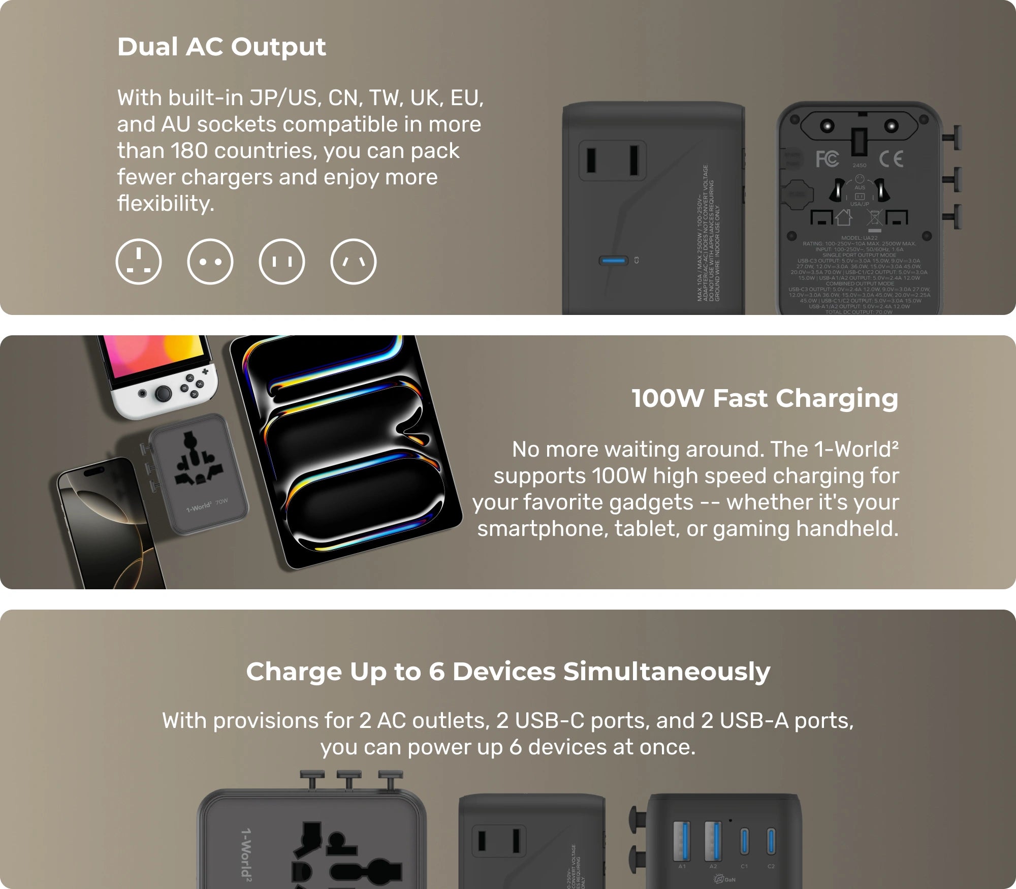 With cutting-edge GaN charging technology, the 1-World² mini travel charger is designed for speed and efficiency. Imagine charging up to 6 devices at once! Plus, we've made it 30% more compact than our old model so you can easily slip this in your bag without weighing you down.