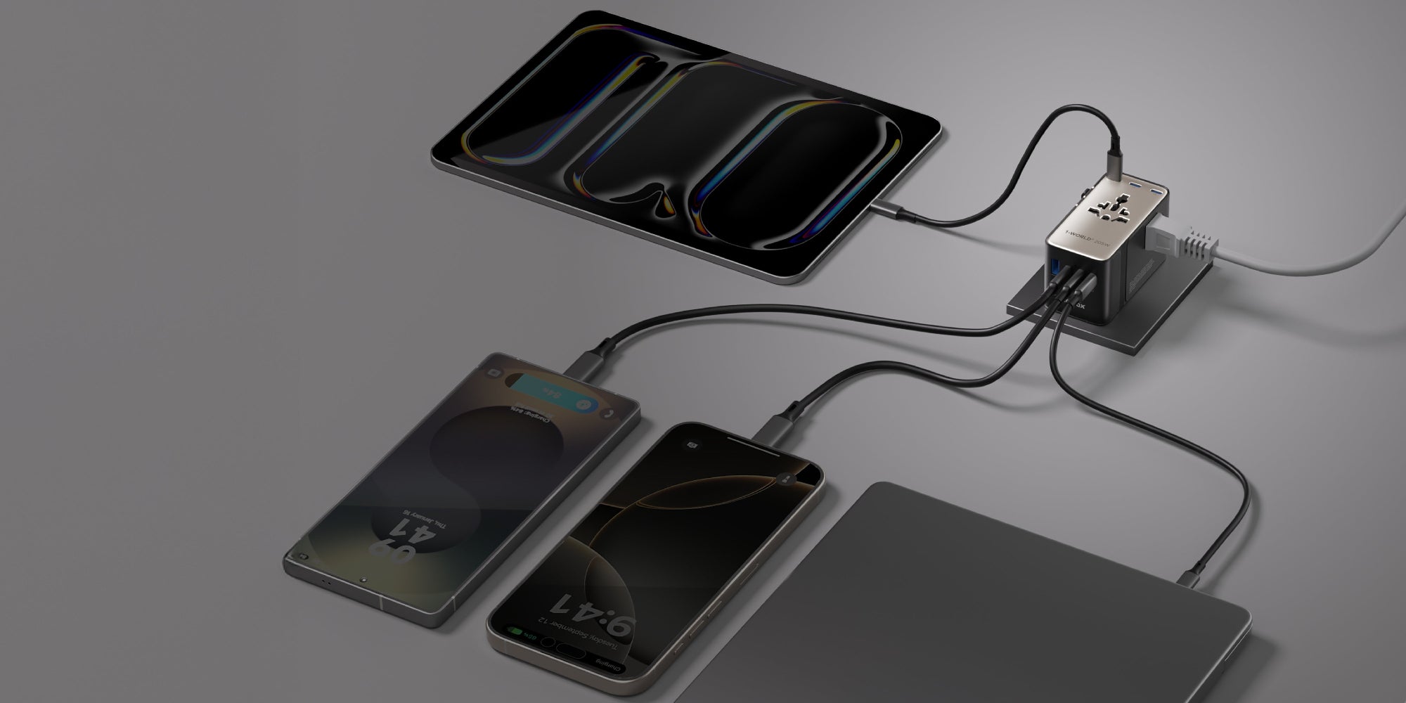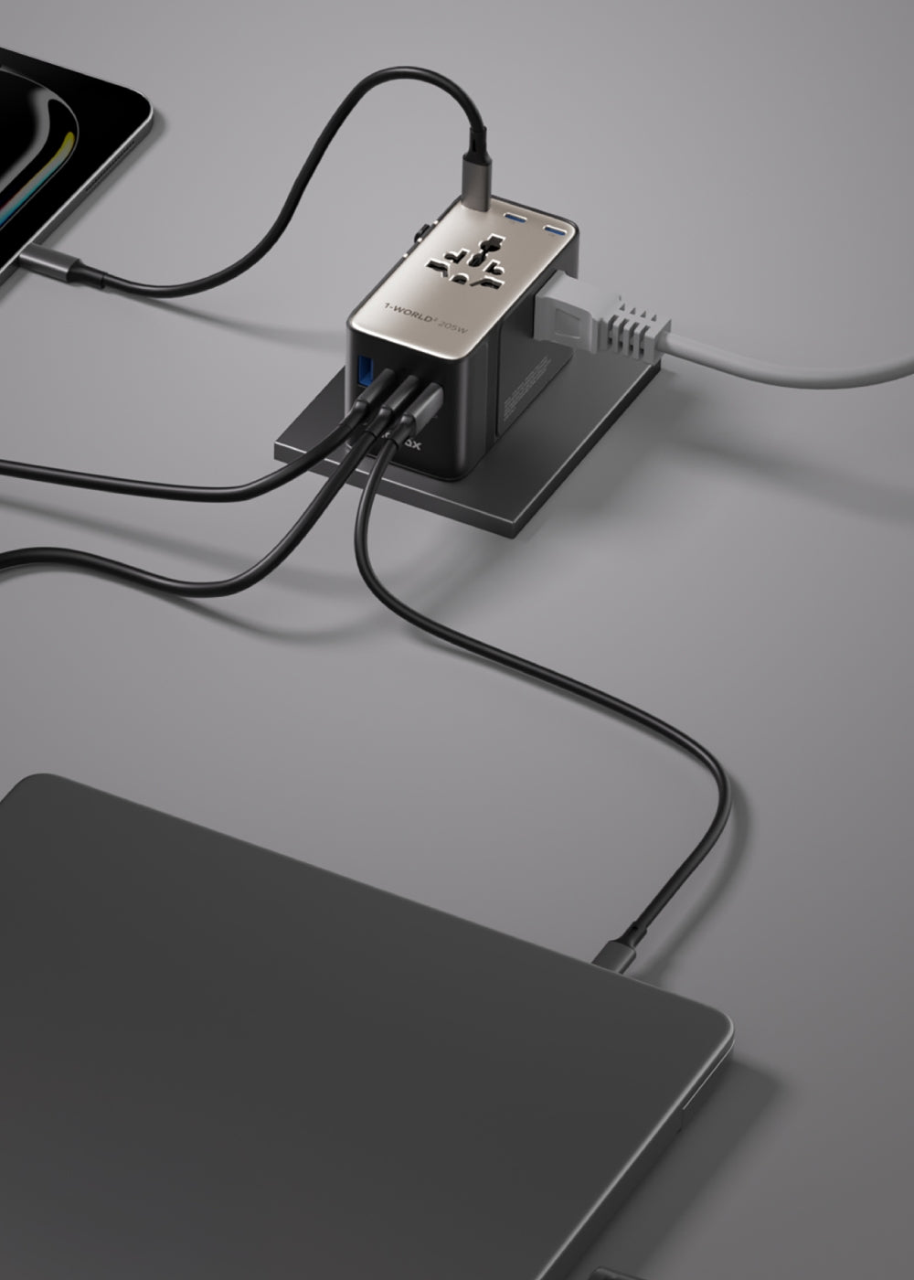 Using GaN technology, the 1-World 4-Port GaN 170W Travel Charger dynamically optimizes power delivery to provide the fastest and safest charging for your MacBook Pro, phones, laptops, and more.